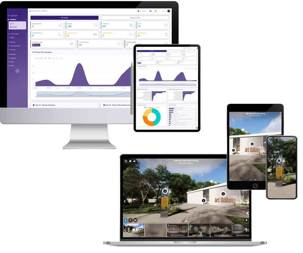 Xem các tour tham quan, triển lãm trên máy tính, máy tính bảng hoặc điện thoại di động theo cùng một trãi nghiệm tương tự.